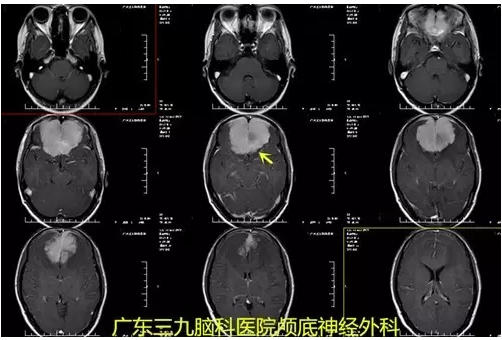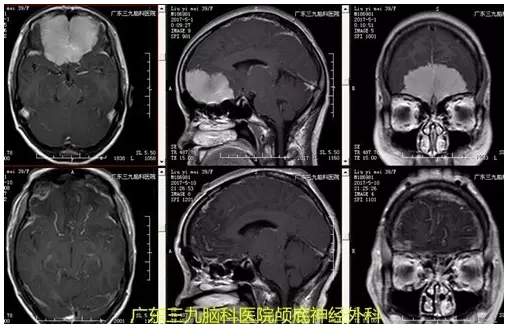 广东三九脑科医院神经外一科张良主任介绍:嗅沟脑膜瘤占颅内脑膜瘤的4.45%,多见于30-50岁的中年人,女性多于男性,常起源于筛骨、筛板处的硬膜,多呈球形生长,可为单侧或双侧,双侧者往往以一侧为主,临床症状 主要有嗅觉障碍、颅内压增高、视力减退、癫痫和精神异常等,但由于额叶属于相对哑区,因此这些症状不易被早期发现,嗅觉障碍也常被误诊为“鼻窦炎”而延误诊断。又因为肿瘤为良性,生长缓慢,早期不易引起头痛、恶心等颅高压症状,致使肿瘤在发现时多 已体积较大。本例患者39岁,为好发年龄,最初以头痛起病,未引起重视,出现视物模糊检查时肿瘤体积已达5.5×6.5×3.7cm。