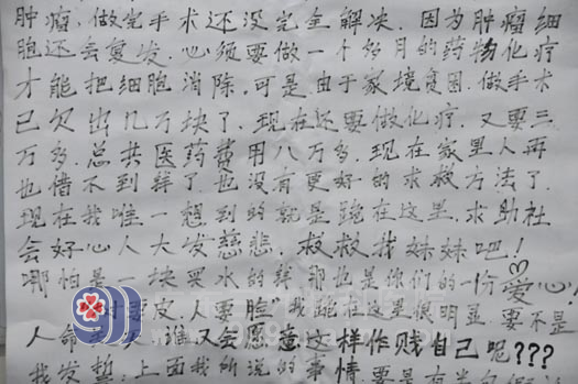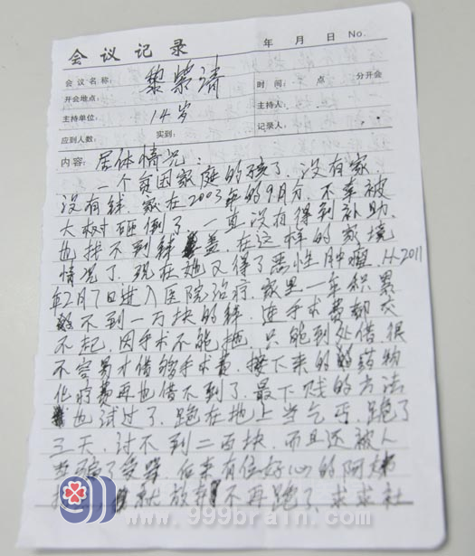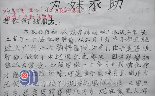 医生的话让黎镇城看到了希望,看着术后恢复如正常人一般的妹妹,黎镇城暗下决心:一定要让妹妹活下去!能走访的亲戚、邻居、朋友都走遍了,眼看钱是无法借到了,为了给妹妹争取“活着”的权利,今年不满25岁的黎镇城做出了一个无奈的决定:沿街乞讨。http://www.999brain.com/