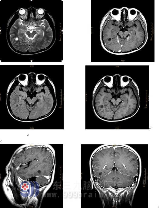 右侧颞叶示一孤立性类圆形长T1、长T2异常信号影,FLAIR序列呈低信号影,周边伴有环形高信号影,病变边界清晰,周围未见脑组织水肿,占位效应不明显,增强后,病变未见异常强化。与外院前片(2007-5-7MRI)对比,病变大小及信号大致同前。诊断:右颞叶病变,考虑胚胎发育不良性神经上皮瘤。