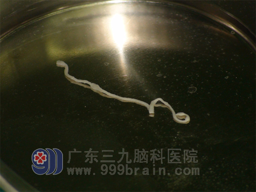 来自安徽的周女士今天就要出院了,一想起从她脑袋里面拿出的那条长达12cm的活虫,她仍心有余悸。2002年,周女士外出干活时不小心摔倒,撞伤头部,此后就经常出现头痛,曾在当地医院做检查未发现异常,其丈夫听当地人说吃生青蛙可以治头痛,于是马上买了两只青蛙回去给太太吃,就这样过了三年。2005年周女士无明显诱因出现左侧面部抽搐,伴嘴角向左上歪斜,双眼上翻,持续约5分钟后缓解,每周发作约2次左右,到当地医院治疗,查头颅MRI提示“右中央异常信号影,考虑为感染性病变”,当时未予治疗。于当年9月份到广东三九脑科医院治疗,诊断为“脑囊虫病”,予以驱虫及抗癫痫治疗,药物治疗后抽搐明显减少,持续时间约1分钟左右。家属遂未再予重视。http://www.999brain.com/