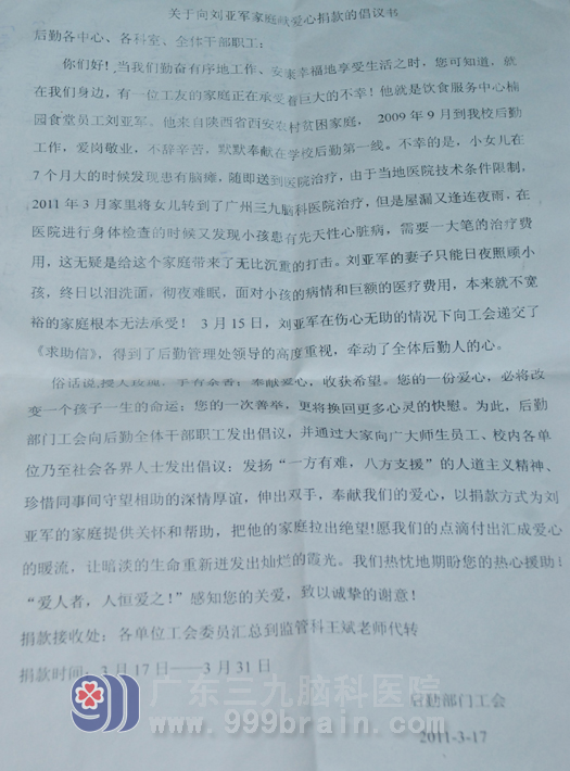 小丸子的父亲是大学城校区华南师范大学的食堂员工,单位工会听说他家的不幸,全院员工都纷纷慷慨解囊,为小丸子捐款,他们希望能在广东三九脑科医院看到小丸子康复的奇迹,希望通过治疗,她能接近正常孩子的健康,和她的姐姐一样,过着无忧无虑的幸福童年。我们也期待着奇迹的出现……