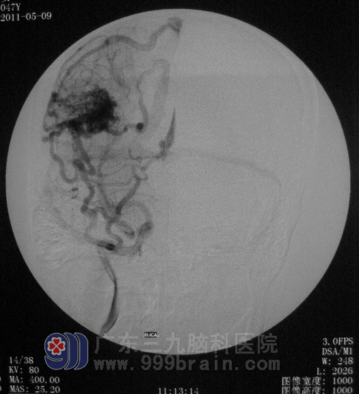 行全脑血管造影检查,结果显示:右颞枕动静脉畸形,约3cm×4cm大小,畸形血管团有三条动脉供血,主要为右侧大脑中动脉分支的供血。经过反复讨论及仔细地斟酌,鲁明主任为杨老师制定下治疗方案:先行部分畸形血管栓塞,再根据栓塞后情况行开颅切除没有完全栓塞的畸形血管。