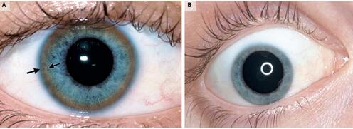 图A为角膜色素环(K-F环),铜沉积于角膜后弹力层所致,绝大多数见于双眼,个别见于单眼。早期常须用裂隙灯检查方可发现。