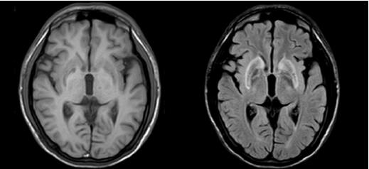 T1加权像壳核、丘脑等处低信号病灶,苍白球呈等信号;T2加权像壳核、丘脑高或稍高信号病灶,但苍白球出现特征性低信号(可能与铜沉积的顺磁作用有关)。