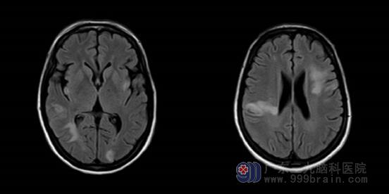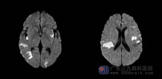 ▲DWI:双侧小脑半球、双侧大脑半球、桥脑右侧多发脑梗塞(亚急性期),左侧额叶异常信号影。