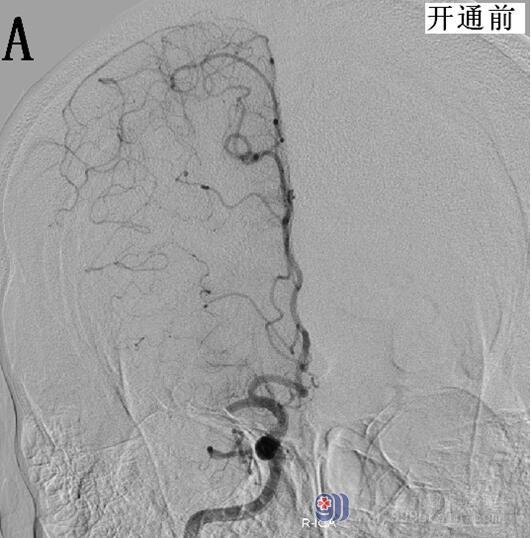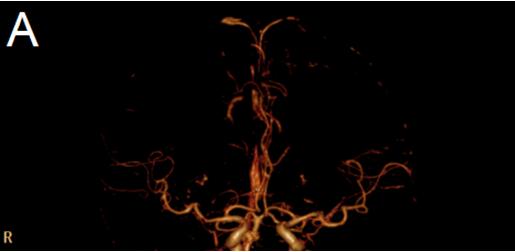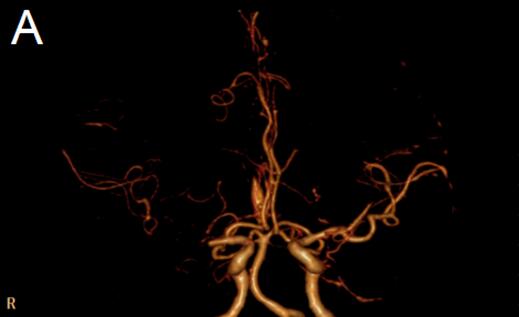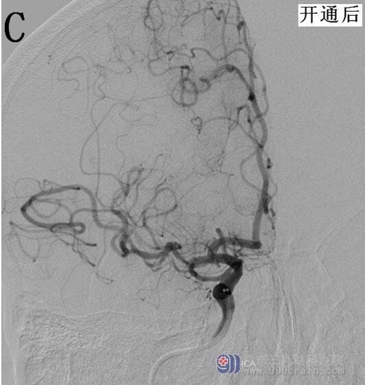 图3 A:1月后复查头颅CTA显示右侧大脑中动脉M1段起始段闭塞已缓解、局部变细,远端分支明显减少较前缓解。