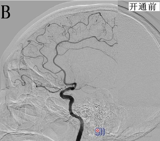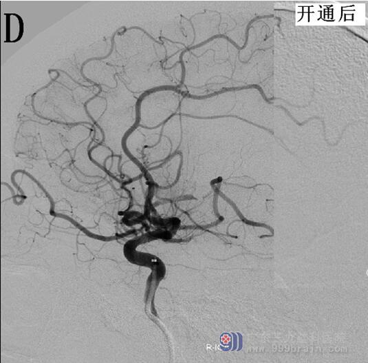 图2 A、B为开通前的脑血管造影;C、D为脑血管开通后的造影显像