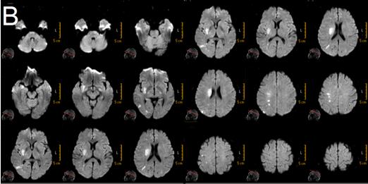 图1 B:右侧基底节、半卵圆中心、颞叶内侧、顶枕叶皮层多发急性梗塞灶(2017/9/6 19:17)