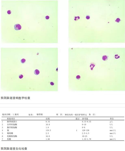 脑脊液检查提示异常脑脊液细胞学,呈混合细胞反应型,以淋巴细胞为主;脑脊液生化:氯(CL-),119.5mmol/L,低。
