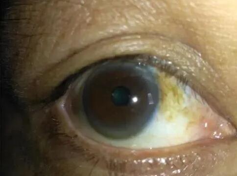 其实,老周除了上肢震颤、下肢无力外,他的双眼眼周像是被一圈黄褐色的圆环所包围,这正是铜离子在角膜处沉积的现象。