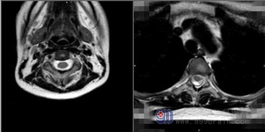 MR全脊柱拼接平扫+增强提示脑干腹侧、胸腰髓周缘多发点线样异常强化影。