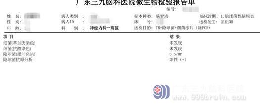 同时完善腰椎穿刺检查,术中见淡黄色清亮脑脊液流出,脑脊液压力超过330mmH2O,对脑脊液标本进行病原学检查发现隐球菌感染的证据。