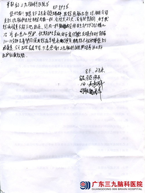 尊敬的三九脑科医院院长、8F护士长: