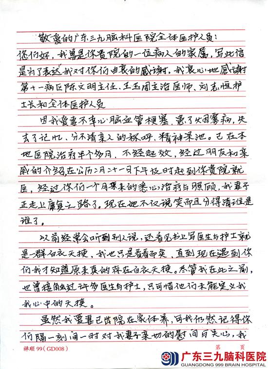 虽然我爱妻已出院在家休养,可我仍然记得你们每隔一会就来病房对我妻子亲切的慰问与关心,我永远忘不了白衣姑娘夜间为妻子以及其他病人盖被子的情形。我面对爱妻糊涂的样子,心情本来低沉到极点,是你们亲切的一举一动驱赶了我的担心,给予了我希望,是你们让我相信在你们细心的照顾下,我的妻子正一天一天地康复起来。www.999brain.com