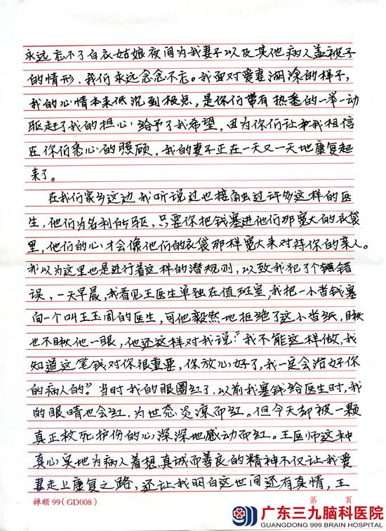 在我们家乡这边我听说过也接触过许多这样的医生,他们为名利所驱,只要你把钱塞进他们那宽大的衣袋里,他们的心才会像他们的衣袋那样宽大来对待你的亲人。我以为这里也是进行着这样的潜规则,以致我犯了个错误,一天早晨,我看见王医生单独在值班室,我把一小沓钱塞向他,可他毅然地拒绝了这小沓纸,瞅也不瞅一眼,他还这样对我说:“我不能这样做,我知道这笔钱对你很重要,你放心好了,我一定会治好你的家人的。”当时我的眼圈红了,以前我塞钱给医生时,我的眼睛也会红,为世态炎凉而红。但今天却被一颗真正救死扶伤的心深深地感动而红。王医师这种真心实地为病人着想,真诚而善良的精神不仅让我爱妻走上康复之路,还让我明白这世间还有真情。王医生,在这里让我向你以及向你一样的医务人员致敬,同时为我的愚昧道歉,你们永远无限“伟大”!www.999brain.com