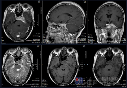 图 1 头颅MR示:左侧鞍区、海绵窦、岩斜区团块状占位,累及蝶窦后部并侵进垂体窝,形态不规则,呈等T1等T2、FLAIR高信号为主,明显强化,邻近硬脑膜强化。