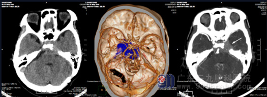 图 2 头部CTA检查示:鞍内-左侧鞍旁-岩斜区-斜坡后方-蝶窦稍高密度占位性病变,病变内可见些许细小血管影,病变包绕左侧颈内动脉C3-C4段、双侧椎动脉末端基底动脉,邻近骨质密度增高。