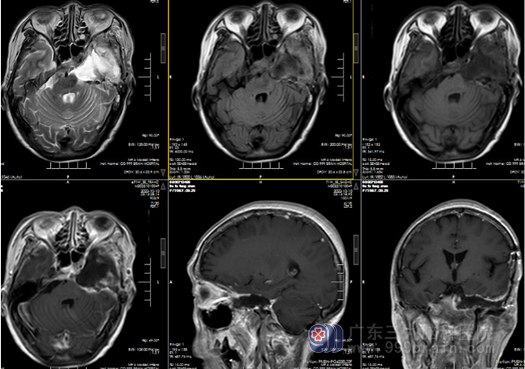 手术耐受情况良好,术后一般情况恢复良好。左侧眼睑下垂,左侧面瘫,左耳听力基本丧失等情况同前 ;神经影像学显示肿瘤大部切除 ;术后治疗 10 天,拆线出院。1月后放疗 45Gy/15f。