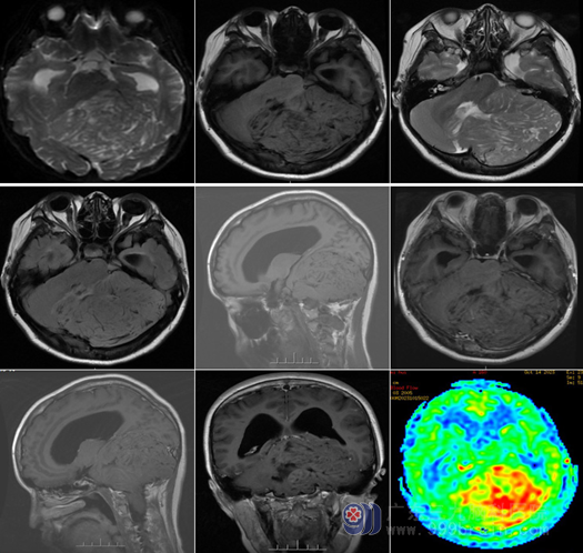 头颅MR:左侧小脑、左侧桥臂示巨大团块状占位,呈等T1等变,原病变已大部分切除。T2、FLAIR序列等高异常信号影,间杂多发长T1长T2、FLAIR序列低信号影,DWI序列呈等稍高信号,ADC图呈等高信号,增强后可见散在线样强化影;病变往椎管内生长达C2椎体水平,邻近脑组织受压变形,小脑幕受压上抬。