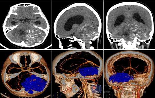 头颈部CTA检查:左侧小脑半球、左侧桥臂巨大占位性病变突入椎管内,病变内可见多发条状不匀钙化影,其内及周围示多发细小血管影,双侧椎动脉及颈总动脉开口位置正常;邻近枕骨受压变薄。