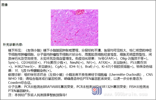 诊疗经过 :2023 年 10 月 18 日在全麻下行扩大后正中倒“L”入路左侧小脑半球 - 脑干占位切除术。手术顺利,术后病理示 :(左侧小脑)小脑发育不良性神经节细胞(Lhermitte-Duclos 病),CNS WHO Ⅰ级 ;PCR 未检测出BRAFV600E 基因突变,PCR 未检测出 IDH1R132H 基因突变 ;FISH 未检测出 PTEN 基因缺失。