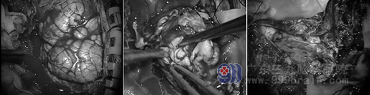 手术过程:剪开硬膜见肿瘤组织,质白,呈巨大脑回样改变,血管位于脑沟内,肿瘤血供丰富,充分减压,大部分切除。