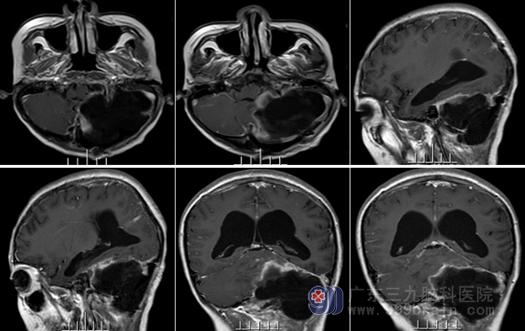 查体 :神志清醒,双侧眼球震颤,瞳孔不等,右侧瞳孔 3mm,直接间接对光反射灵敏,左侧瞳孔 4mm,直接间接对光反射迟钝,双眼视力显著下降,双侧视野缩窄,双侧鼻唇沟对称,伸舌偏左,闭目难立征阳性,一字步征阳性,指鼻试验阳性。头部 MR 提示 :左侧小脑半球 - 脑干巨大占位病变,继发枕骨大孔疝、幕上梗阻性脑积水,考虑小脑发育不良性神经节细胞瘤,左侧颞部蛛网膜囊肿,左侧小脑上动脉、小脑前后下动脉远端分支增多,MRV未见明显异常。听觉诱发电位 :左耳 80db 未引出,右耳80db 可引出。听力测试 :左耳 97db,右耳 30db。