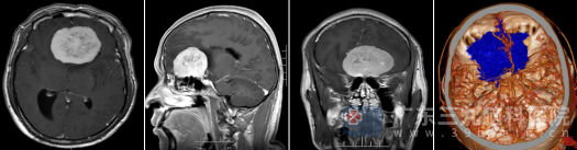 入院后,医院为苏某安排了详细的术前头颅MR检查。影像结果显示:前颅窝底示一团块状占位性病变,大小约为57.0×52.0×44.0mm(相当于一个较大鸡蛋大小),且增强后呈现明显异常强化影。这个位置毗邻重要的神经和血管,手术难度极大。