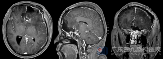 在当地医院,头部CT检查结果让所有人大吃一惊:前颅窝存在巨大占位,考虑肿瘤病变。为寻求进一步治疗,患者及家属慕名来到广东三九脑科医院神经外十科。