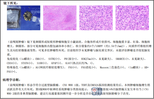 术后复查头颅MR显示:原病灶切除术后改变,未见肿瘤残留。术后病理结果回报为:过渡型脑膜瘤,CNS WHO 1级(中枢神经系统肿瘤分级,1级为良性)。得知是良性肿瘤且切除干净,苏某的家属激动不已。
