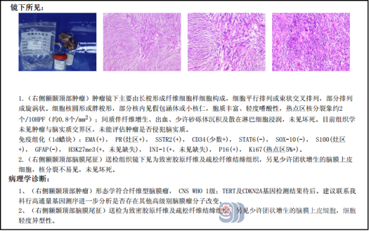 最终的病理诊断结果为“形态学符合纤维型脑膜瘤,CNS WHO 1级”。这是一个良性肿瘤的诊断,意味着通过这次成功的手术切除,陈某已达到了临床治愈的效果,后续仅需定期复查即可。
