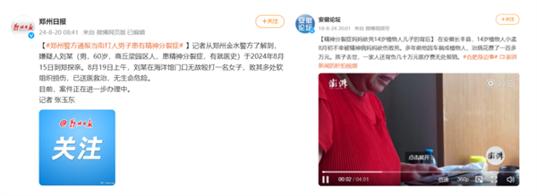 其实对于精神分裂症发病的新闻报道已经有许多,如郑州警方通报当街打人男子患精神分裂症;安徽一精神分裂症妈妈砍死14岁植物人。精神分裂症患者在严重时会因幻觉妄想而产生激越行为,直接危害到人身安全。