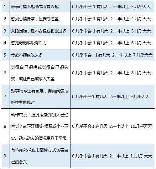PHQ-9,又名9条目患者健康问卷,是条目简单、使用简便的自评量表,操作性强,它只有很多心理量表一半内容,却有相似的信效度,PHQ-9量表检测抑郁灵敏性与HAMD他评量表评分显著相关。但是在此声明,自评量表由于被测者心理暗示等原因可能会导致结果有一定误差,故评估结果仅供参考。