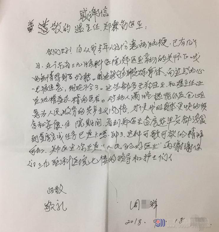 你们好!自从我去年八月份患病脑梗,已有几个月。在广东省三九脑科医院郑医生亲切的关怀下,我的病情得到了好转,现在能够锻炼身体。而过去的心里很焦急,现在不会了。这些都多亏郑医生和温主任。正是他精益求精的医术,对病人满腔热枕以及全心全意为人民服务的共产主义风格,才使我的身体更快的恢复和安康。住院期间,看到郑医生查房连早餐都没食,到查房完成任务已是十二点钟了,这种可歌可泣的精神可嘉。郑医生你正是“人民的好医生”。再谢谢你们三九脑科医院七楼的领导和护士!