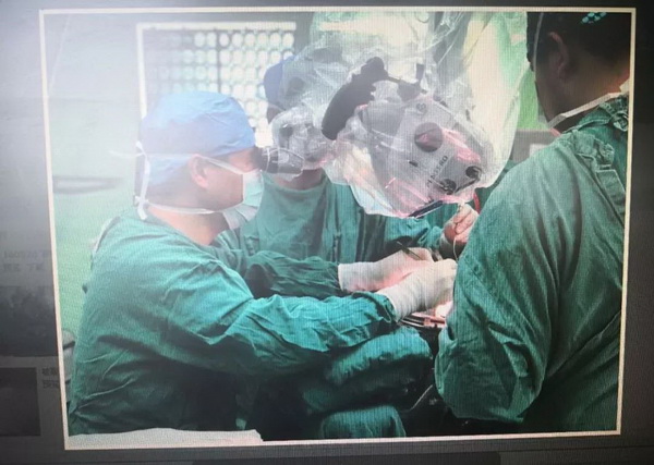 完善相关检查后,准备择期手术。因其上呼吸道感染,手术推迟到5月21日。当天上午,鲁明主任为患者在全麻唤醒麻醉下行右侧额顶叶寄生虫取出术及肉芽组织切除术。通过术中导航定位病变部位,在神经电生理监测下,一条长约7.5厘米的白色裂头蚴活虫很快进入医生视野,并被熟练地“擒拿”。术中,患者被唤醒,在其清醒的状态下切除病灶,使其语言、肢体功能均未受损。