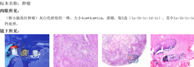 病理结果:(桥小脑角区肿瘤)组织学形态考虑偏良性病变,