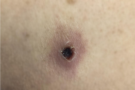 被恙虫咬出的黑色焦痂。
