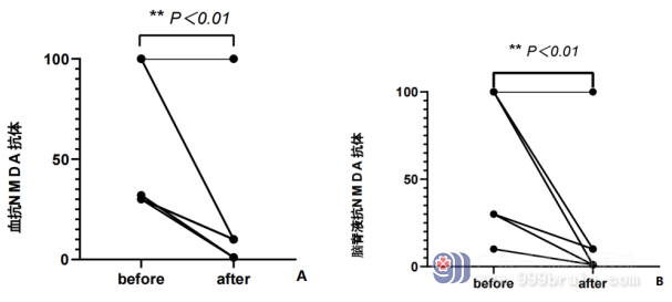 图1 10例抗NMDA受体脑炎患者治疗前后血清抗NMDA抗体滴度(A)、脑脊液抗NMDA抗体滴度(B)变化