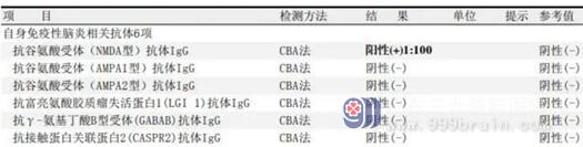 送检脑脊液标本,完善自身免疫性脑炎相关抗体6项检测,结果回报:NMDA抗体阳性1:100。