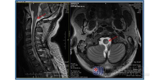 颈部MR:延髓左后下部至颈1-3水平脊髓偏左后异常信号影。