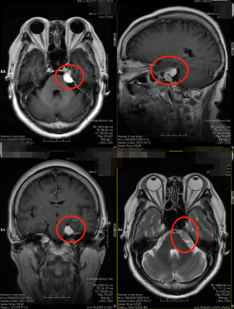 入院后完善相关检查,主管医生详细告知病人和家属手术风险,以及确定的手术方式。取得同意后,择期进行了“左侧桥小脑角区占位切除术”,术中全程采用神经电生理监测,术程顺利,术后进监护病房严密监护生命体征。