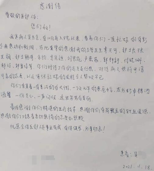 术后,吴先生又微笑着继续唱小曲了,为了答谢医务人员,专程写了一封感谢信。