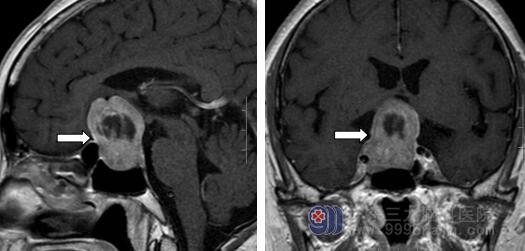 住院后安排于奶奶进行详细的检查,行内分泌检验、视力及视野检查、垂体MR平扫+增强检查,磁共振报告结果提示:鞍内及鞍上区占位性病变,大小约27*27*37mm,增强后不均匀强化,包绕邻近右侧颈内动脉及海绵窦,视交叉及垂体柄受压。