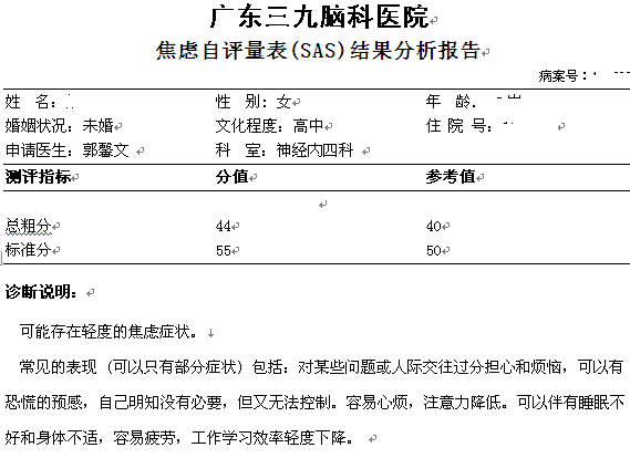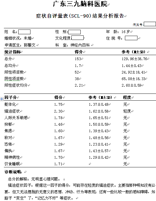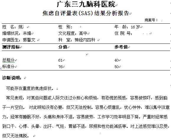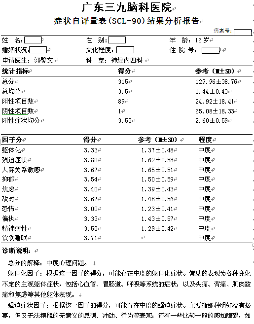 姚某,16岁, 2008年就读小学四年级时可能因与同学相处差逐步出现情绪低落、学习动力下降、不敢抬头看人、自卑,出现情绪易激惹,现记忆力下降,夜间听见“嗡嗡——”声,看见天花板有“波动感”,照镜子觉得“镜子中的自己越看越陌生”,晚上独处或人多时能听见女声或多人的声音在议论她。2015年就诊于某医院,具体治疗不详。入院前患者大哭,说看见天花板有“波动”,自行将半个多月的药物一次性服完,用剪刀不断划自己左手腕,被家人急送入医院洗胃。为进一步治疗遂来我院就诊。患者此发病以来,睡眠差,进食可,大小便未见异常,近期体重无明显变化。入院时心理测量:SCL-90:存在中度躯体化症状,中度强迫症状,中度抑郁症状。SAS:76分,SDS:79分。MMPI:心理状态高度异常。