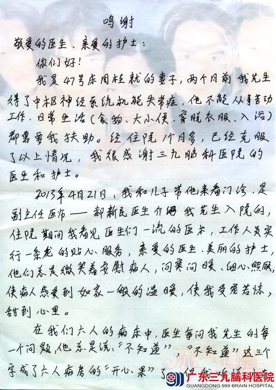 我是47号床周桂就的妻子,两个月前我先生得了中枢神经系统机能失常症,他不能从事苦工作,日常生活(食物、大小便、穿脱衣服、入浴)都需要我扶助。经住院1个月多,已经克服了以上情况,我很感谢三九脑科医院的医生和护士。
