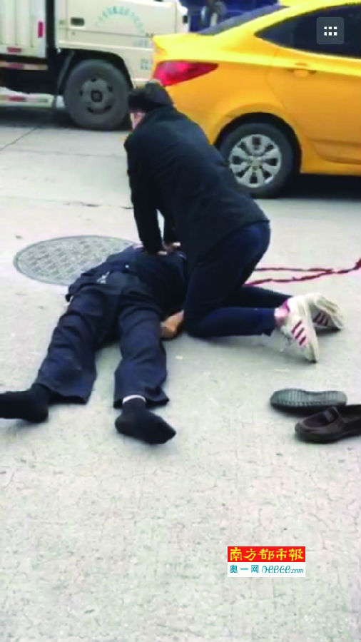 2016年11月24日,医生郑霖勃跪地急救车祸伤者。视频截图
