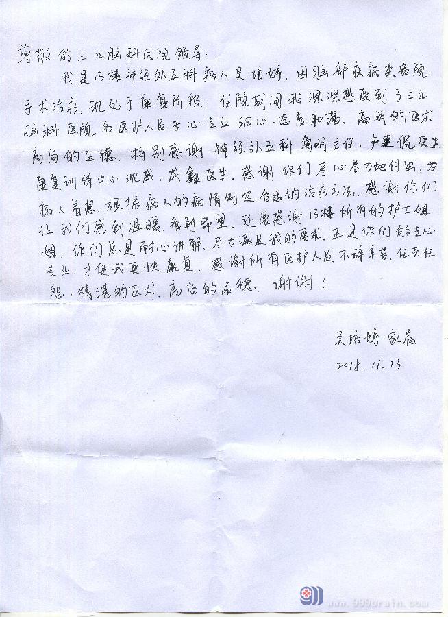 尊敬的三九脑科医院领导: