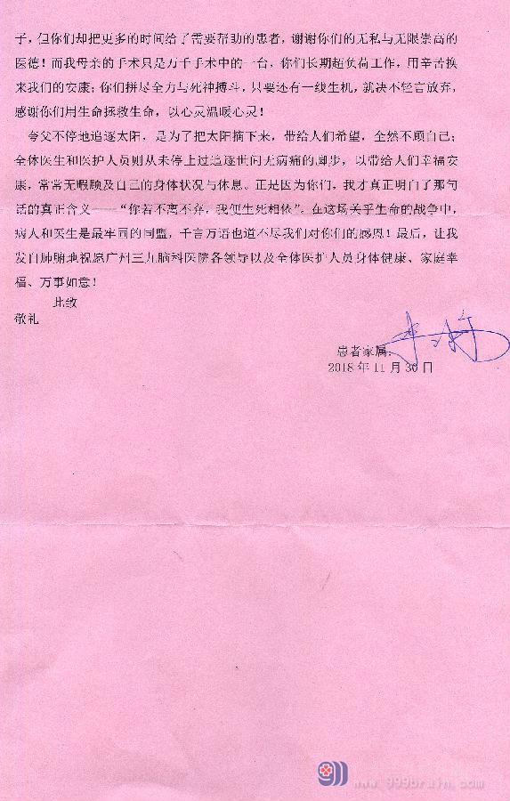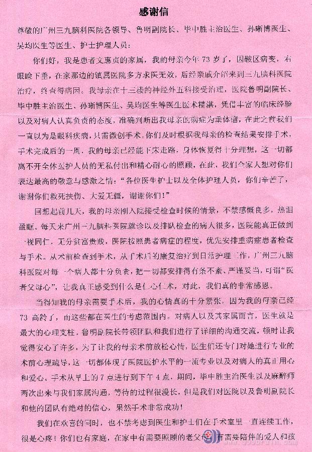 你们好,我是患者文惠贞的家属,我的母亲今年73岁了,因鞍区病变,右眼睑下垂,在家那边的镇属医院多方求医无效,后经亲戚介绍来到三九脑科医院治疗,终查得病因。我母亲在十三楼的神经外五科接受治理,医院鲁明副院长、毕中胜主治医生、孙晰博医生、吴均医生等医生医术精湛,凭借丰富的临床经验以及对病人认真负责的态度,准确判断出我母亲的病症为垂体瘤,在此之前我们一直以为是眼科疾病,只需微创手术。你们及时根据我母亲的检查结果安排手术,手术完成后的一周,我的母亲已经能下床走路,身体恢复得十分理想,这一切都离不开全体医护人员的无私付出和精心耐心的照顾,在此,我们全家人想对你们表达最高的敬意与感激之情:“各位医生护士以及全体护理人员,你们辛苦了,谢谢你们救死扶伤、大爱无疆,谢谢你们!”