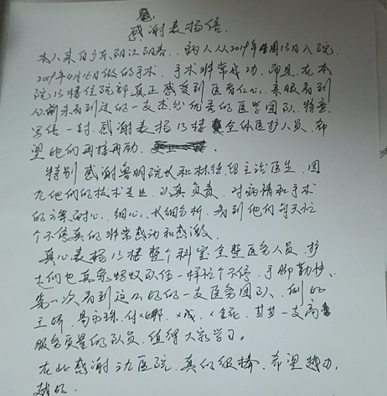 本人来自广东阳江阳春,病人从2019413日入院,2019416日做的手术,手术非常成功。而且,在本院13楼住院部,真正感受到医者仁心,亲眼看到从前未看到过的一支杰出优秀的医学团队,特意写信一封,感谢表扬13楼全体医护人员,希望她们再接再厉。