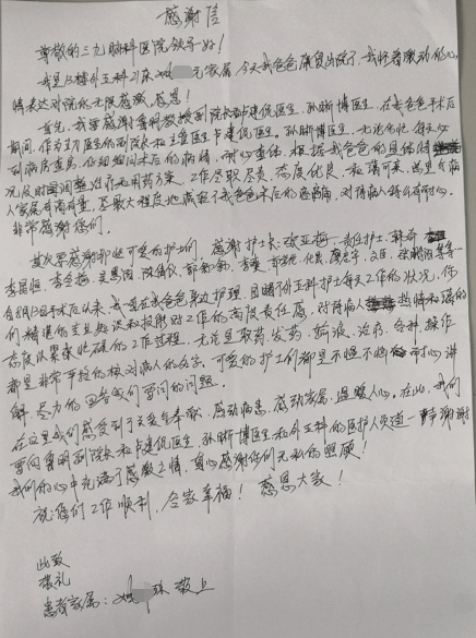 听神经瘤术后康复出院,家属致信感谢